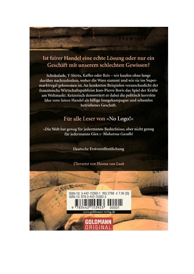 Boris, Jean P: Un)Fair Trade. 1. Auflage. München, Goldmann Verlag 2006. 183x125 mm. 224 S. Taschenbuch. Versandkosten: 2,32 EUR